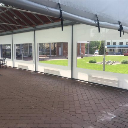 - Das Material besteht aus einem aus hochfester Polyesterfaser gewebten Stoff, dessen Oberfläche mit pigmentiertem PVC behandelt wurde; das Material wird mit der Technologie Precontraint in zwei Richtungen vorgespannt; diese Technologie stellt eine große Maßstabilität und Festigkeit sicher